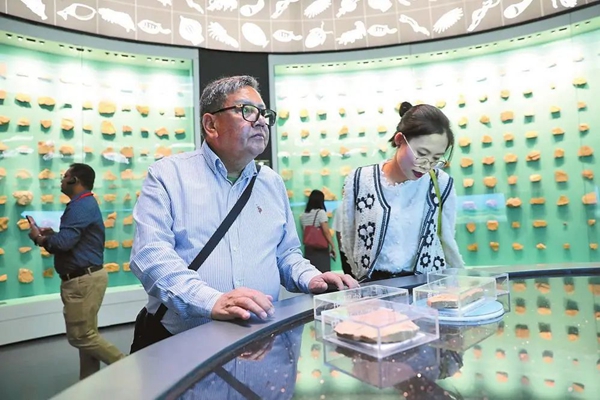 “從演化的角度來看,人類的祖先可以追溯到小小的昆明魚?!痹诔谓刈匀徊┪镳^,伴隨著講解,嘉賓們通過LED球形屏科普視頻、智能體感互動游戲等現代科技手段,直觀了解5億多年來生命演變的精彩歷程。孟加拉國獨立電視臺副總編輯沙明·阿布杜拉·扎赫迪贊嘆技術賦能文旅科教的同時,也希望在自然地理紀錄片方面與云南媒體展開合作,共同探索和記錄雙方的自然風光與生態多樣性。