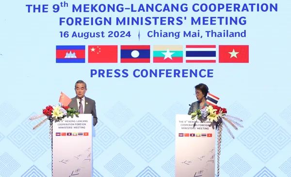 當地時間2024年8月16日,瀾滄江—湄公河合作第九次外長會在泰國清邁舉行。會后,中共中央政治局委員、外交部長王毅同泰國外交部次長艾斯麗共同會見記者。