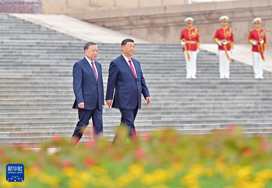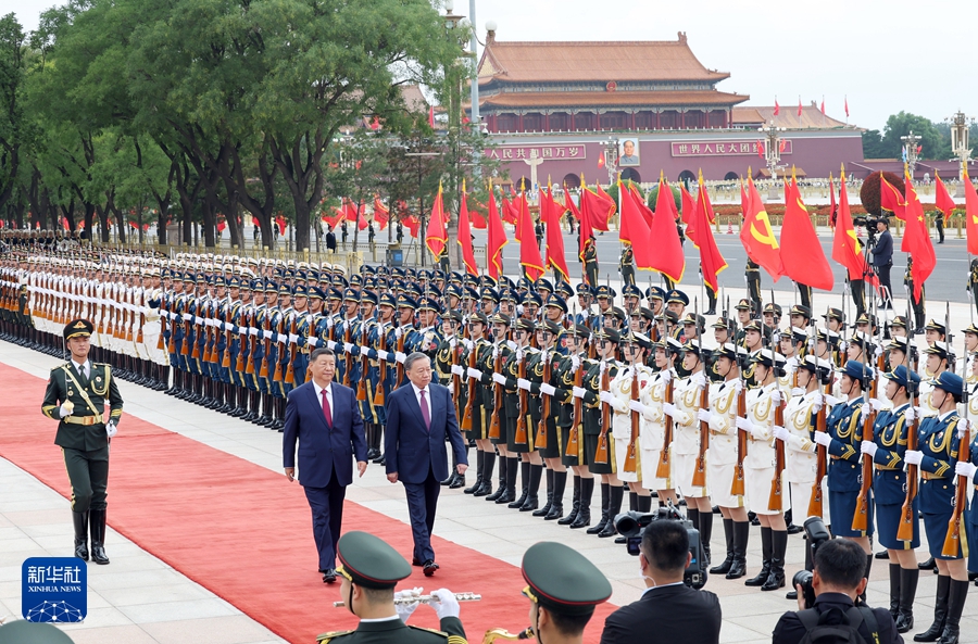 蘇林抵達時,禮兵列隊致敬。習近平同蘇林登上檢閱臺,軍樂團奏中越兩國國歌,天安門廣場鳴放21響禮炮。蘇林在習近平陪同下檢閱中國人民解放軍儀仗隊,并觀看分列式。