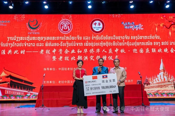 方大使代表使館向老方捐贈救災援款,并見證在老中資機構和華人華僑向老方轉交晚會現場募集的十五億基普善款,用于幫助老撾人民抗洪救災。