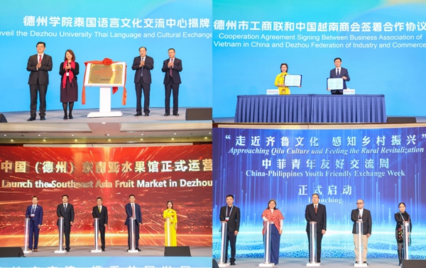 開幕式上,德州學院泰國語言文化交流中心揭牌,中國越南商會與德州市工商聯簽訂合作協議,德州市外辦和河海大學簽署合作框架協議,中國(德州)東南亞水果館、“走近齊魯文化感知鄉村振興”中菲青年友好交流周活動啟動。