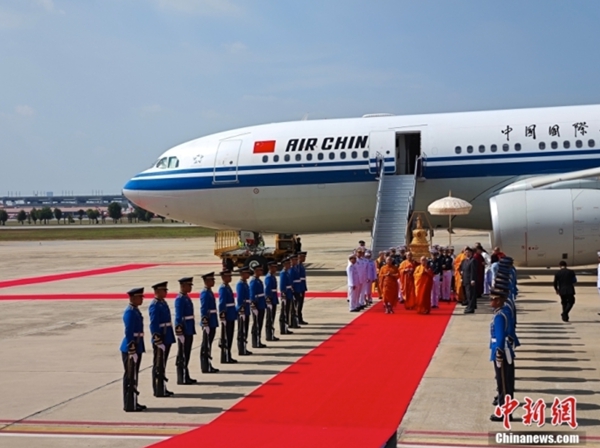 當地時間4日中午,佛牙舍利抵達泰國曼谷廊曼機場,中國國家宗教事務局局長陳瑞峰、中國駐泰國大使韓志強,泰國副總理素里亞、外交部長瑪里以及中泰兩國高僧等共同出席迎接儀式。