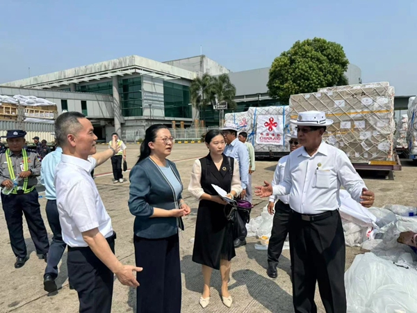 2025年3月31日13點45分,中國政府向緬甸提供的首批緊急人道主義救災物資運抵緬甸仰光國際機場。中國駐緬甸大使馬珈、緬甸仰光省首席部長梭登、中國駐緬甸使館歐陽道冰參贊等赴機場迎接。