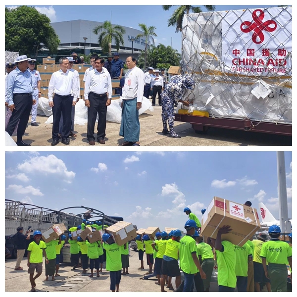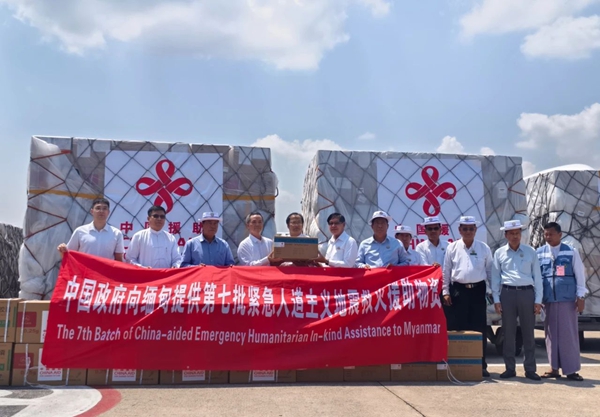 當地時間4月20日12點30分,中國政府向緬甸提供的第七批緊急人道主義地震救災物資運抵仰光國際機場。中國駐緬甸使館歐陽道冰參贊、仰光省首席部長梭登赴機場迎接。