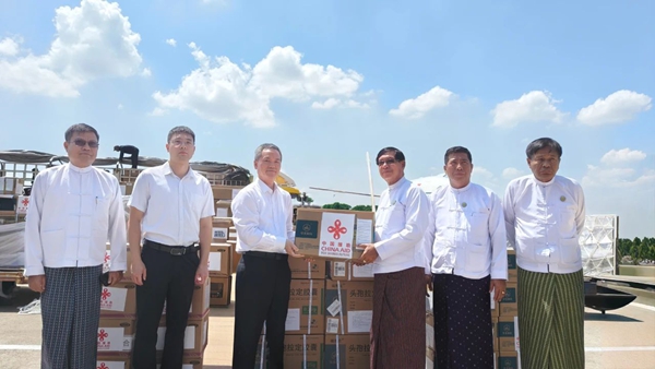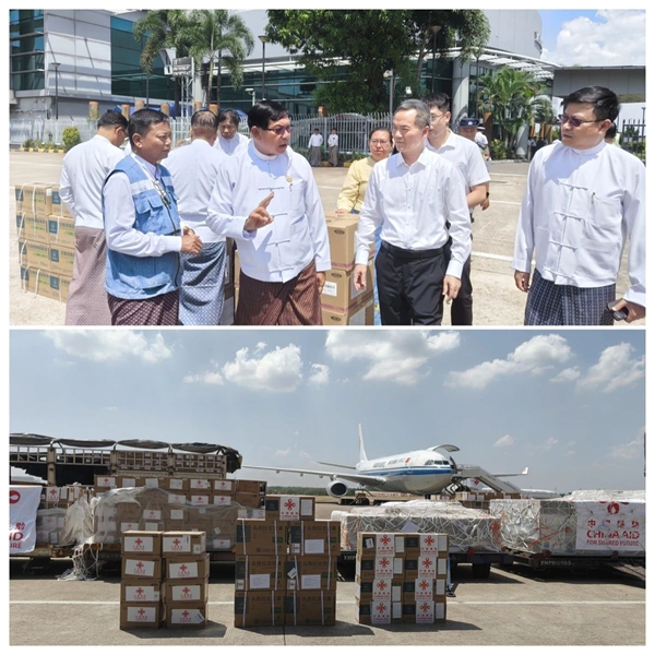 當地時間4月22日12點30分,中國政府向緬甸提供的第八批緊急人道主義地震救災物資運抵仰光國際機場。中國駐緬甸使館歐陽道冰參贊、仰光省首席部長梭登赴機場迎接。