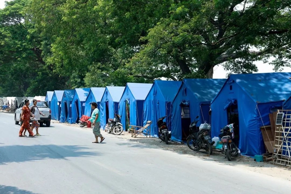 這是位于緬甸曼德勒城內足球場的一個地震災民安置點,數十個白色救災帳篷整齊搭建在綠茵茵的足球場上,帳篷頂上的“中國紅十字會”字樣格外醒目。