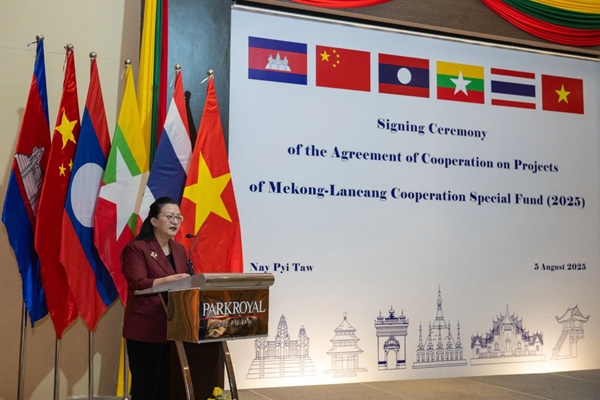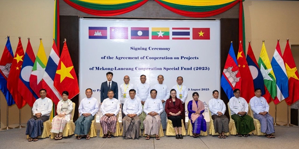 8月5日,2025年瀾湄合作專項基金項目合作協議簽約儀式在內比都舉行。馬珈大使與緬甸國家安全與和平委員會成員、外交部長丹穗致辭,與緬外交部副部長戈戈覺簽署協議。鄭志宏公參及來自緬交通與通訊、法律、宗教與文化、農業、自然資源與環保、工業、教育、科技、社會福利與救濟安置部的9名部長出席。