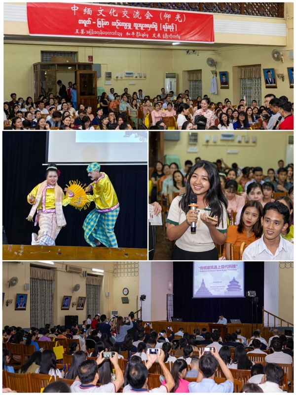 8月19日,中緬文化交流會在仰光大學舉行,駐緬甸使館參贊李千國、仰光大學校長丁貌通、緬甸作家協會主席翁貌、國家博物館(仰光)館長楠勞瑩及院校師生、各界代表400余人出席。