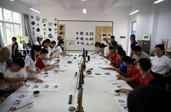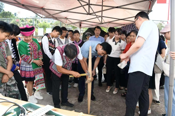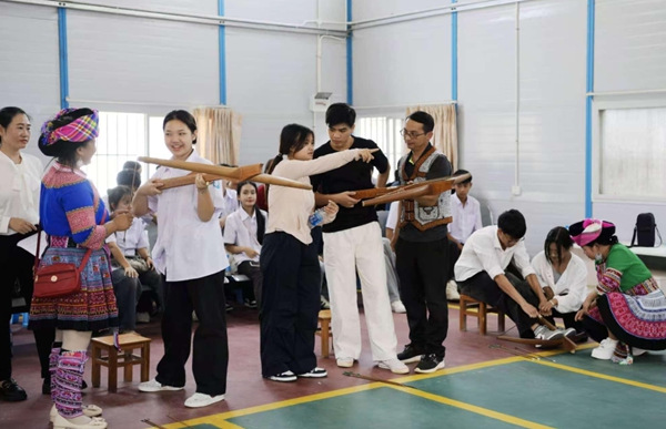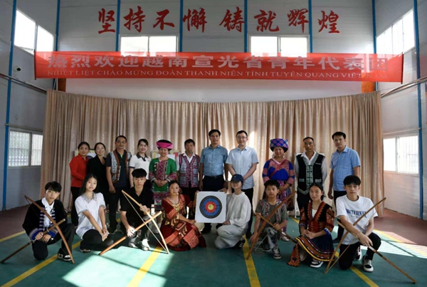 活動期間,中越青年首先聚焦民族文化傳承,在非遺體驗中感受文明交融。在彝族白倮蠟染工坊與漢字書法課堂,兩國青少年合作完成“中越友誼”雙語書法作品,質樸筆法中,傳遞著對友誼的本真表達;省級射弩非遺代表性傳承人吳朝榮在猛硐瑤族鄉射弩館,向兩國青少年展示瑤族“削木為弩、搓線為弦”的古老智慧,“共同御敵、心手相連”的歷史佳話引發共鳴。在體驗環節中,中越青年選手爭相競技,當弩箭射中靶環時,雙方相互擊掌喝彩,越南青年代表馬氏玄妙感慨:“紅藍靶環如中越邊境山水相連,更似此刻我們緊緊相依的心?!?/p>