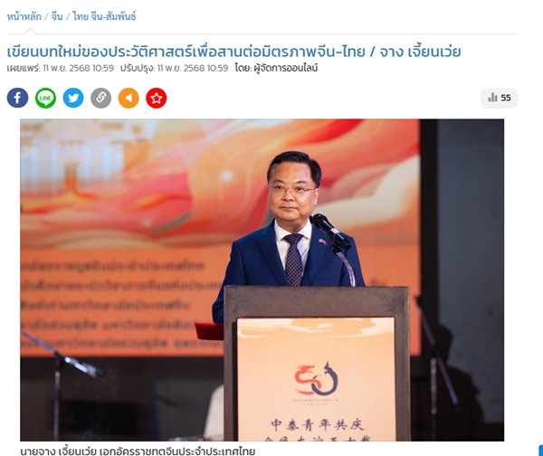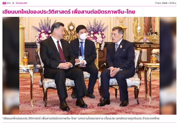 11月11日,在泰國國王哇集拉隆功即將對中國進行國事訪問之際,駐泰國大使張建衛在《泰叻報》《每日新聞》《經理人報》等泰國主流媒體發表署名文章《為賡續中泰友好再譜歷史新篇》。全文如下: