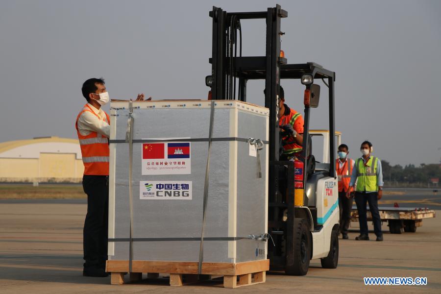 Workers transfer the China-donated Sinopharm COVID-19 vaccines at the Phnom Penh International Airport in Phnom Penh, Cambodia, Feb. 7, 2021. A chartered flight carrying the first batch of the China-donated Sinopharm COVID-19 vaccines arrived in Cambodia on Sunday, welcomed by Prime Minister Samdech Techo Hun Sen at the Phnom Penh International Airport. (Photo by Gao Bingnan/Xinhua)