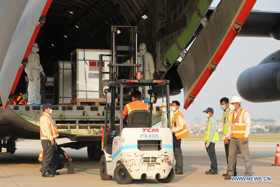 Workers transfer the China-donated Sinopharm COVID-19 vaccines at the Phnom Penh International Airport in Phnom Penh, Cambodia, Feb. 7, 2021. A chartered flight carrying the first batch of the China-donated Sinopharm COVID-19 vaccines arrived in Cambodia on Sunday, welcomed by Prime Minister Samdech Techo Hun Sen at the Phnom Penh International Airport. (Photo by Gao Bingnan/Xinhua)