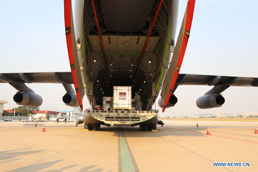 Workers prepare to transfer the China-donated Sinopharm COVID-19 vaccines at the Phnom Penh International Airport in Phnom Penh, Cambodia, Feb. 7, 2021. A chartered flight carrying the first batch of the China-donated Sinopharm COVID-19 vaccines arrived in Cambodia on Sunday, welcomed by Prime Minister Samdech Techo Hun Sen at the Phnom Penh International Airport. (Photo by Gao Bingnan/Xinhua)