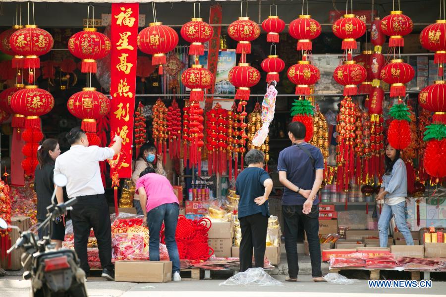 People shop for the upcoming Spring Festival at a market in Vientiane, Laos, on Feb. 4, 2021. Spring Festival, or Chinese Lunar New Year, falls on Feb. 12 this year. (Photo by Kaikeo Saiyasane/Xinhua)