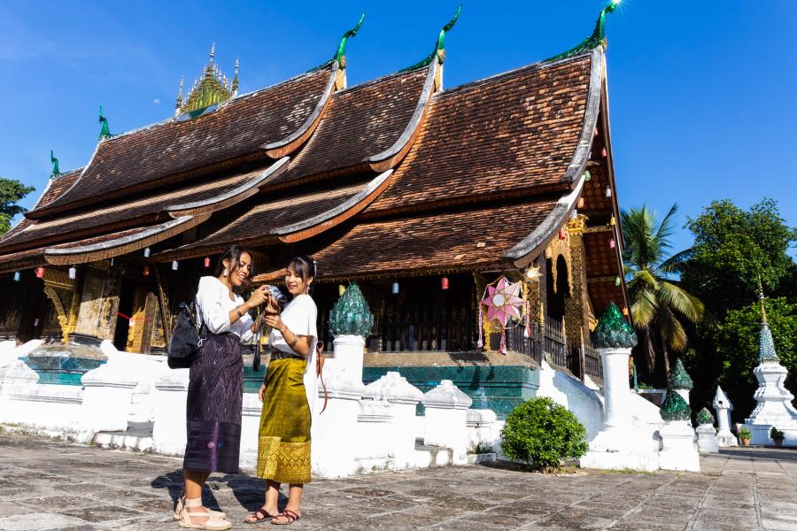 Travelers take photos in front of a temple in Luang Prabang, Laos, on Oct. 7, 2020. (Photo by Kaikeo Saiyasane/Xinhua)