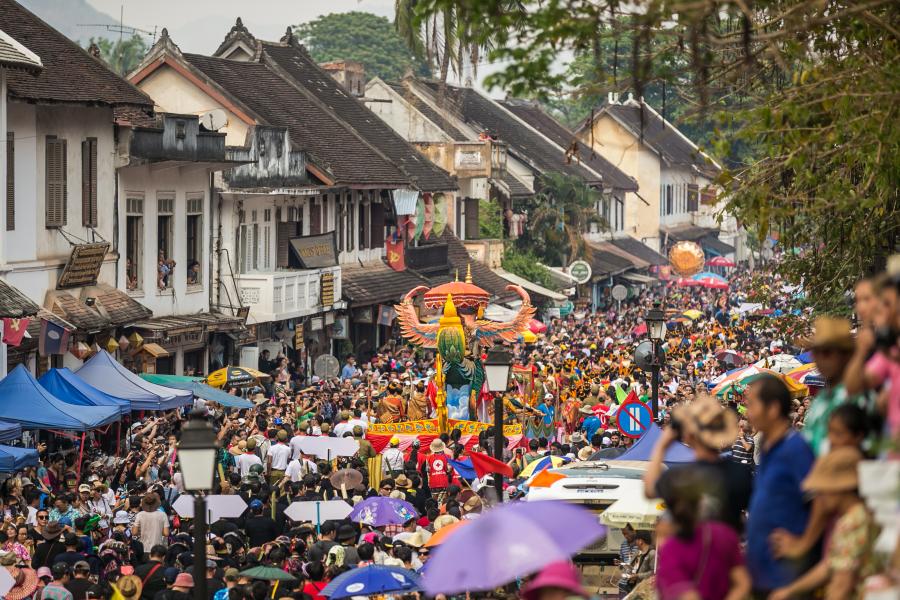 Photo taken on April 15, 2019 shows the scene of the Lao New Year parade in Luang Prabang, Laos. (Photo by Kaikeo Saiyasane/Xinhua)