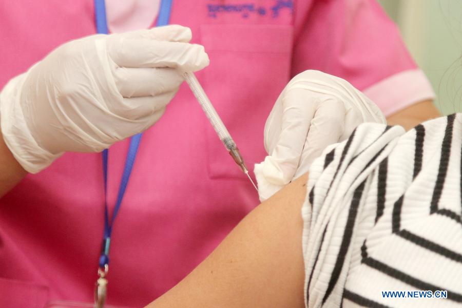 A Cambodian nurse gives a shot of the COVID-19 Sinopharm vaccine to a woman at the National Pediatric Hospital in Phnom Penh, Cambodia on Feb. 18, 2021. The Southeast Asian country launched an anti-COVID-19 inoculation drive on Feb. 10 after receiving the first batch of Sinopharm vaccine from China. According to an official report, as of Thursday, a total of 16,612 people including 2,169 women had been inoculated with the vaccine. (Photo by Phearum/Xinhua)