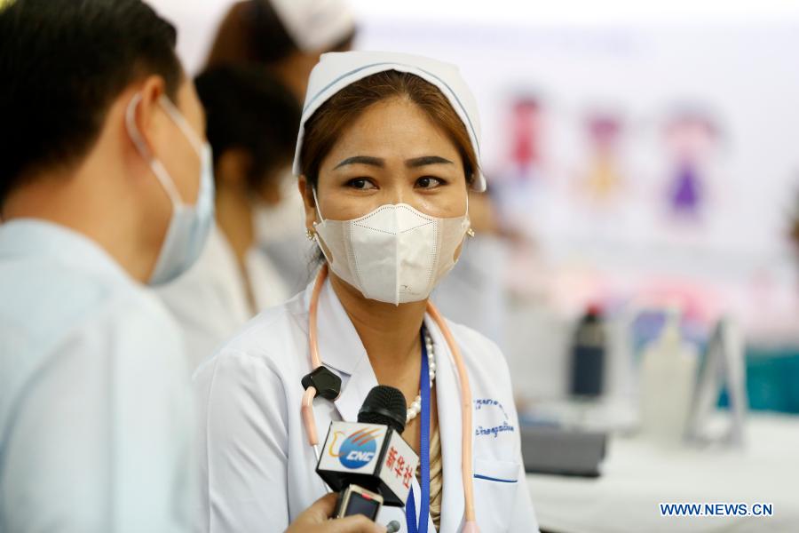 Thong Kimsoklina, a nurse at the National Pediatric Hospital of Cambodia, receives an interview with Xinhua in Phnom Penh, Cambodia on Feb. 18, 2021. The Southeast Asian country launched an anti-COVID-19 inoculation drive on Feb. 10 after receiving the first batch of Sinopharm vaccine from China. According to an official report, as of Thursday, a total of 16,612 people including 2,169 women had been inoculated with the vaccine. (Photo by Phearum/Xinhua)