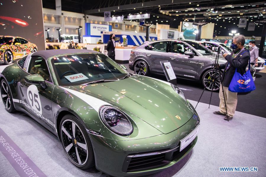 Visitors view cars at the 42nd Bangkok International Motor Show in Bangkok, Thailand, March 24, 2021. The motor show will be held from March 24 to April 4 in Bangkok, where at least 34 car and motorcycle companies will exhibit their products. (Xinhua/Zhang Keren)
