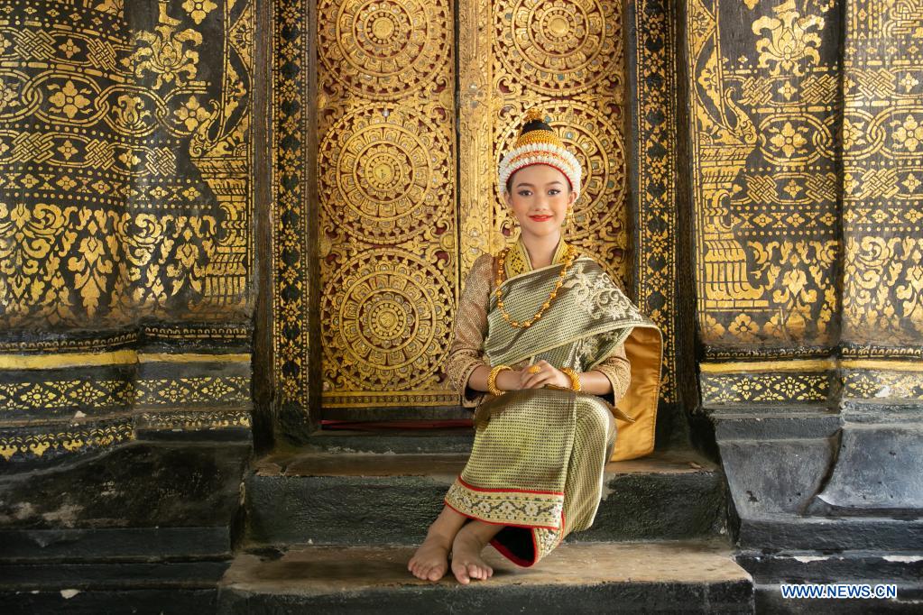 A girl wearing a traditional dress poses for a photo in a temple during the Songkran Festival or the Lao New Year in Luang Prabang, Laos, April 15, 2021. (Photo by Kaikeo Saiyasane/Xinhua)
