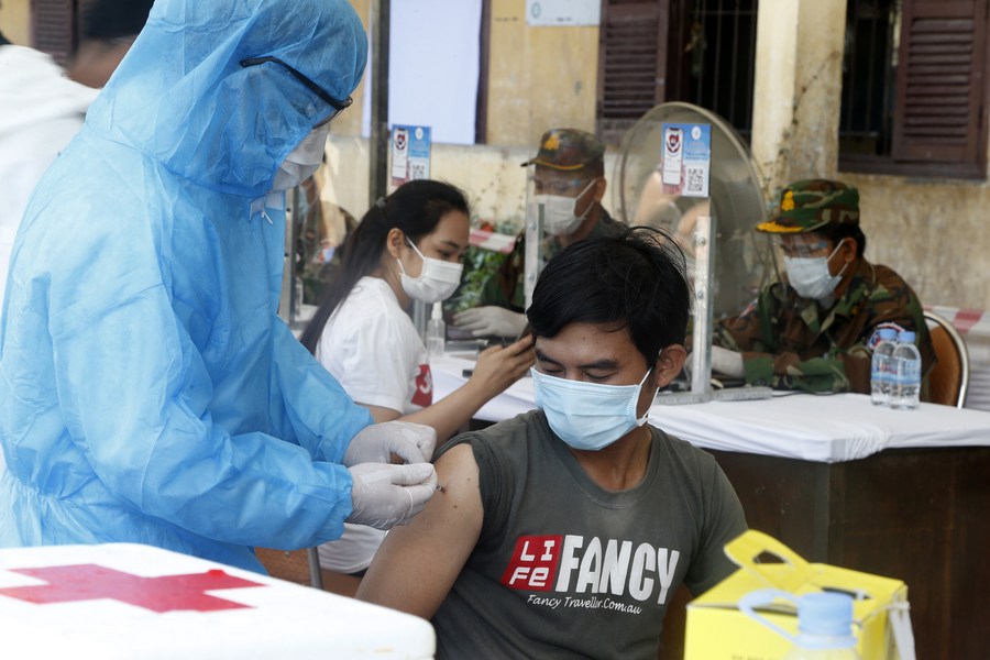 A health worker gives a shot of the Chinese Sinopharm COVID-19 vaccine to a man at an inoculation site in Phnom Penh, Cambodia, May 1, 2021. (Photo by Phearum/Xinhua)
