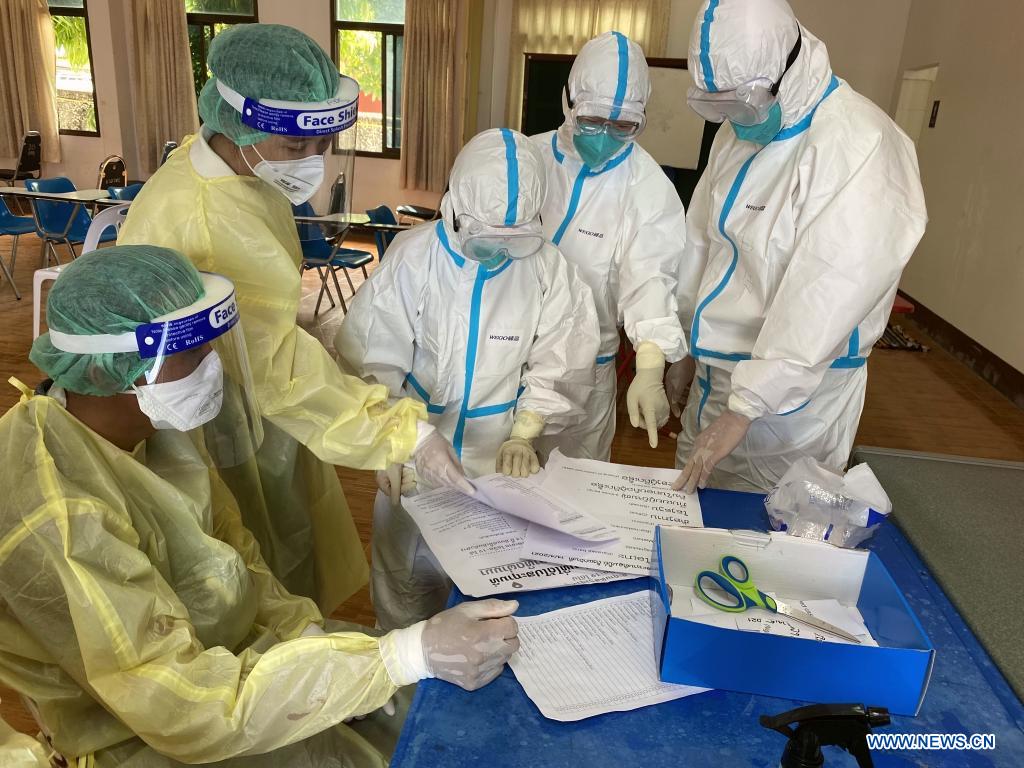 Members of a Chinese medical expert team visit a COVID-19 sampling site in Vientiane, Laos, May 7, 2021. A team of Chinese medical experts, along with medical materials, arrived in Lao capital Vientiane on Tuesday to assist Laos in fighting the COVID-19 pandemic. The medical team will help the Lao side in upgrading the precaution and treatment scheme, improving the technical level and response capabilities, studying the trend of the COVID-19 epidemic and making corresponding recommendations. (Chinese medical expert team/Handout via Xinhua)