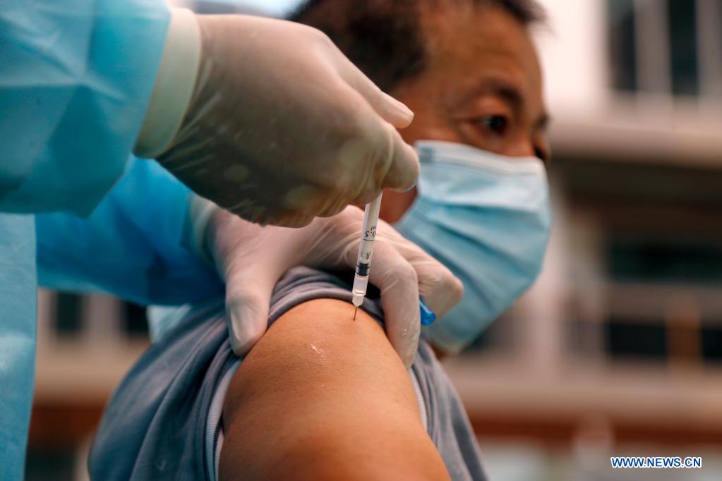 A man receives his first dose of China's Sinovac COVID-19 vaccine at a vaccination site at the Diamond Island in Phnom Penh, Cambodia, on May 12, 2021. To date, more than 1.82 million out of the country's 16 million population had been vaccinated against the virus, a government report said. (Photo by Phearum/Xinhua)