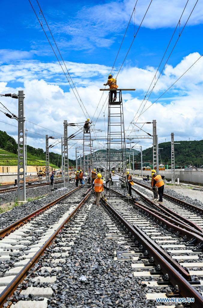 Construction workers work at Ning'er Station on the China-Laos railway in Ning'er Hani and Yi Autonomous County of Puer City, southwest China's Yunnan province, July 2, 2021. The China-Laos railway, which stretches more than 1,000 km from Kunming, capital of China's Yunnan province, to Vientiane of Laos is scheduled to open in December this year. Upon completion, it will slash the travel time between the two cities to less than one day, according to China State Railway Group Co., Ltd. (Xinhua/Wang Guansen)