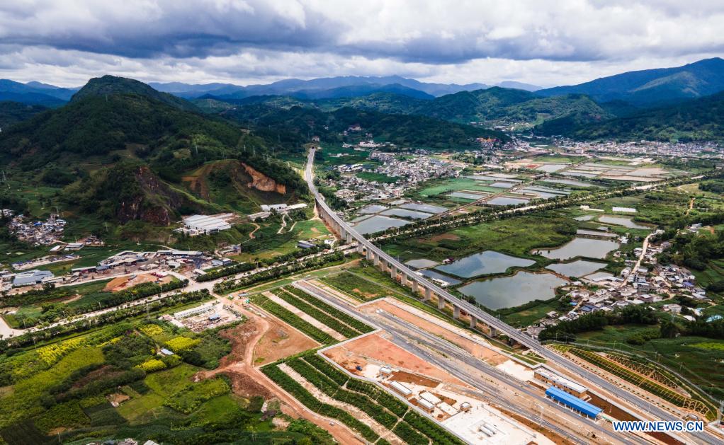 Aerial photo taken on July 2, 2021 shows a section of the China-Laos railway under construction in Ning'er Hani and Yi Autonomous County of Puer City, southwest China's Yunnan province. The China-Laos railway, which stretches more than 1,000 km from Kunming, capital of China's Yunnan province, to Vientiane of Laos is scheduled to open in December this year. Upon completion, it will slash the travel time between the two cities to less than one day, according to China State Railway Group Co., Ltd. (Xinhua/Wang Guansen)