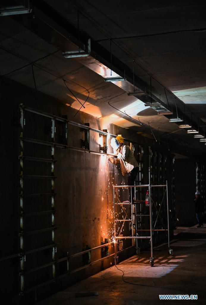 A construction worker works at Puer Station on the China-Laos railway in Puer City, southwest China's Yunnan province, July 2, 2021. The China-Laos railway, which stretches more than 1,000 km from Kunming, capital of China's Yunnan province, to Vientiane of Laos is scheduled to open in December this year. Upon completion, it will slash the travel time between the two cities to less than one day, according to China State Railway Group Co., Ltd. (Xinhua/Wang Guansen)