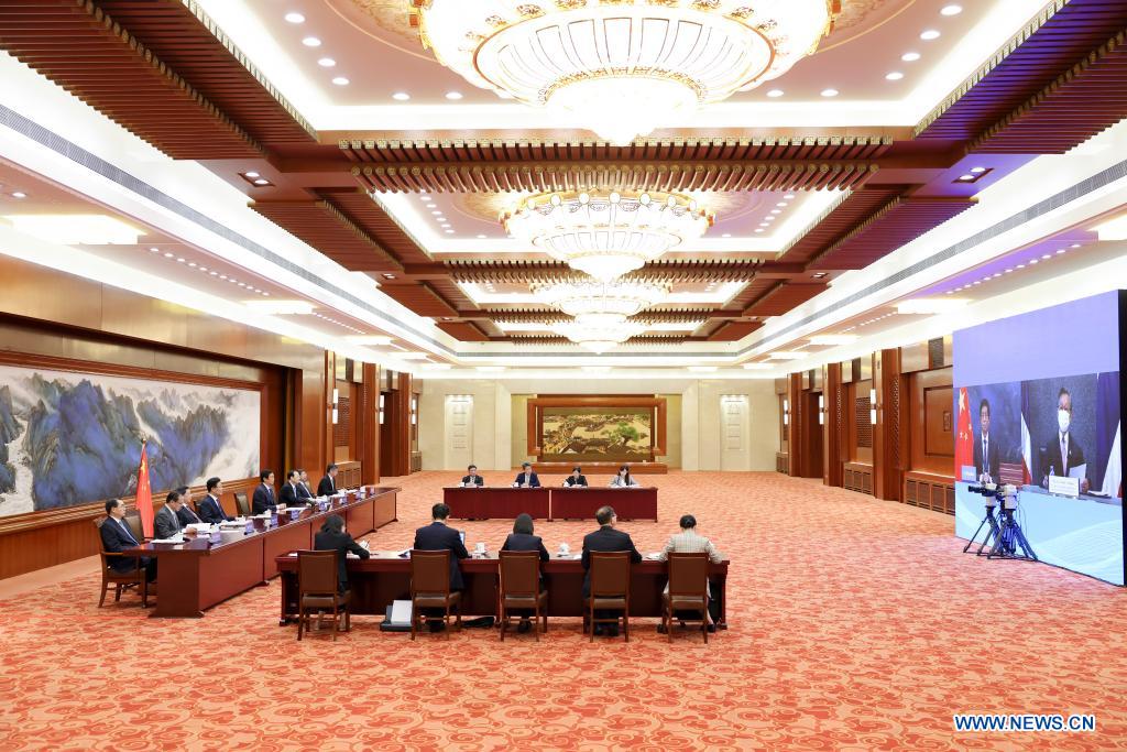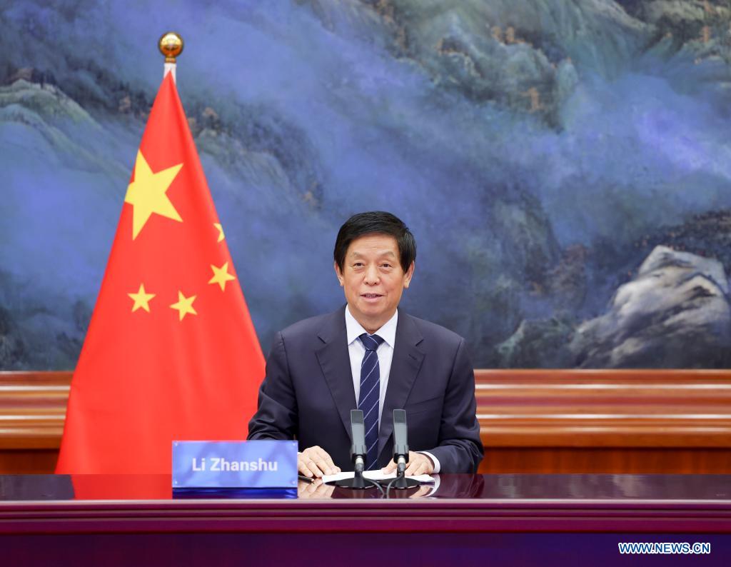 China's top legislator Li Zhanshu held talks with Chuan Leekpai, president of the Thai National Assembly and speaker of the House of Representatives, via video link on Tuesday, with both sides pledging to enhance exchanges between their legislative bodies.