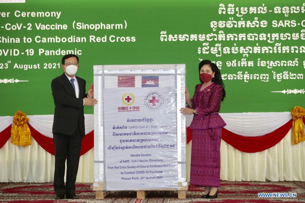 The new donation included 500,000 doses from China's Ministry of National Defense to Cambodia's Ministry of National Defense and 100,000 doses from the Red Cross Society of China to the Cambodian Red Cross.
