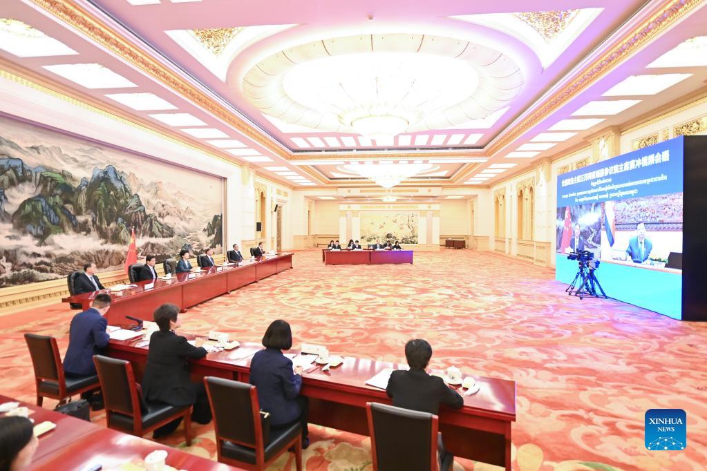 Wang Yang, chairman of the Chinese People's Political Consultative Conference National Committee, meets with Cambodia's Senate President Samdech Say Chhum via video link in Beijing, capital of China, Oct. 12, 2021. (Xinhua/Li Xiang)