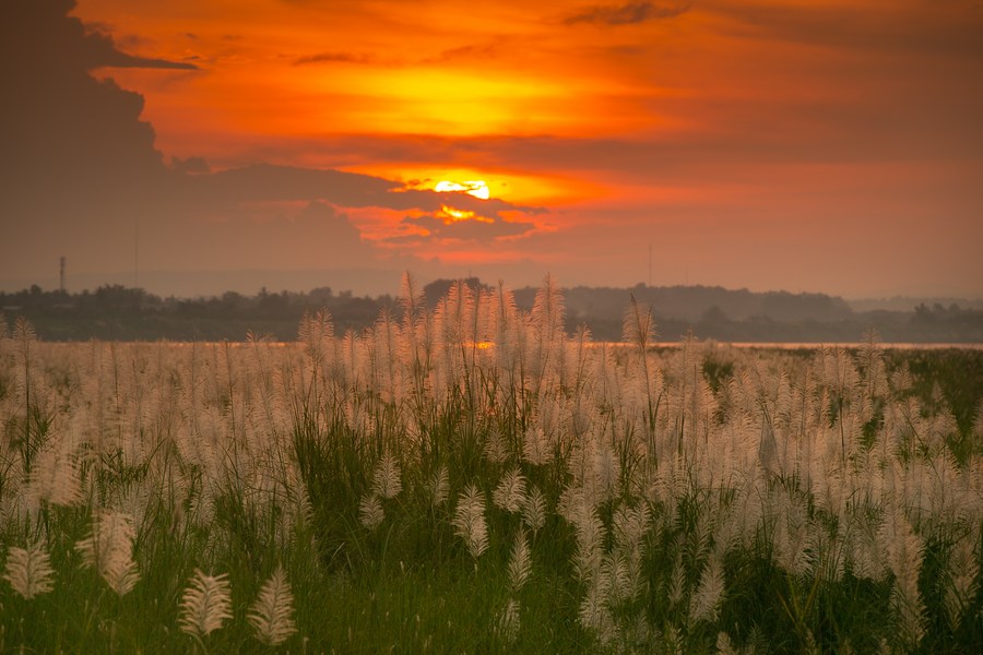 The Mekong River winds along the west side of Vientiane, the capital of Laos. Reeds on the sandbanks sway in the October sunset glow, attracting people to enjoy the beauty of nature.