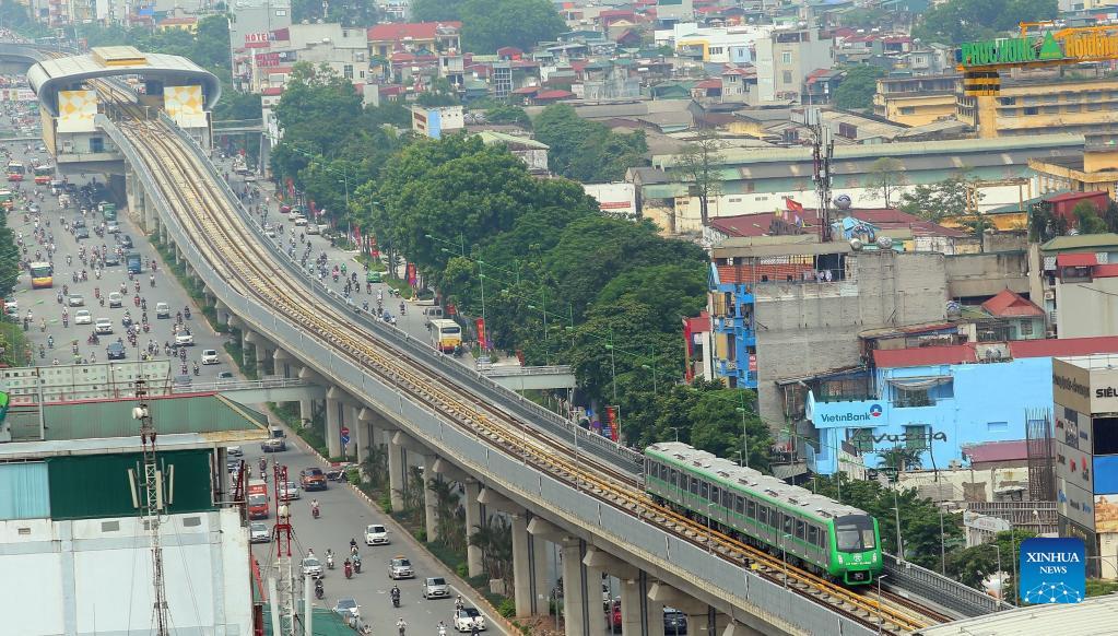Photo taken on Nov. 6, 2021 shows a train running on Cat Linh-Ha Dong metro line in Hanoi, Vietnam. Authorities of the Vietnamese capital Hanoi inaugurated the China-built Cat Linh-Ha Dong metro line project on Saturday, making it the first metro line in the country to start commercial operation. The project was handed over to Hanoi by its investor, the Vietnamese Ministry of Transport, on the same day. (VNA via Xinhua)