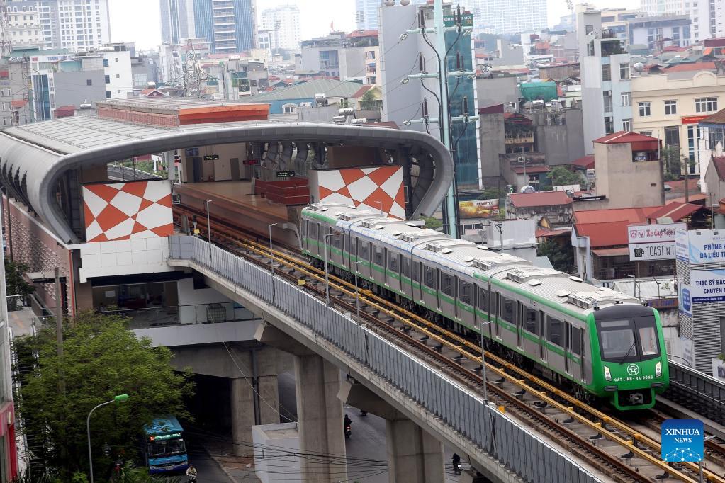 Photo taken on Nov. 6, 2021 shows a train running on Cat Linh-Ha Dong metro line in Hanoi, Vietnam. Authorities of the Vietnamese capital Hanoi inaugurated the China-built Cat Linh-Ha Dong metro line project on Saturday, making it the first metro line in the country to start commercial operation. The project was handed over to Hanoi by its investor, the Vietnamese Ministry of Transport, on the same day. (VNA via Xinhua)