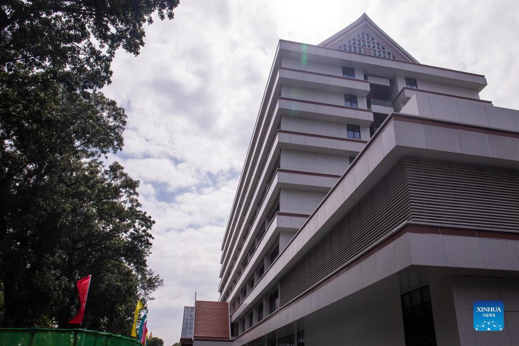 Photo taken on Nov. 11, 2021 shows the exterior view of the Mahosot General Hospital in Vientiane, Laos. As a landmark project in China-Laos cooperation in public welfare, the China-aided health project includes the expansion of the existing Mahosot Hospital in Vientiane and the construction of new in-house medical facilities, with a construction area of approximately 54,000 square meters to hold 600 beds. (Photo by Kaikeo Saiyasane/Xinhua)