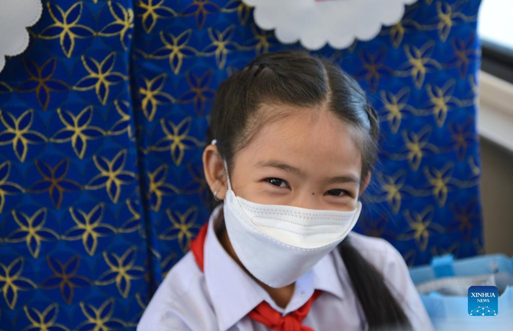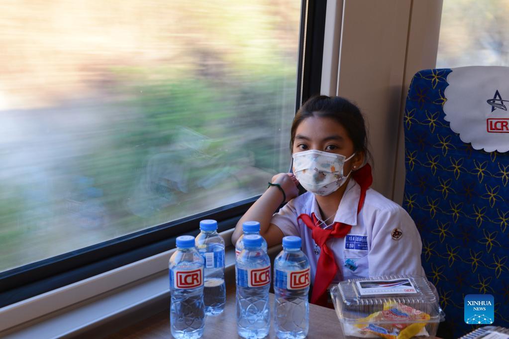 A student from the China-Laos Friendship Nongping Primary School is seen on the Lane Xang EMU train of the China-Laos Railway on Dec. 3, 2021. The China-Laos Railway, a flagship project of the Belt and Road Initiative (BRI), started operation on Friday. (Photo by Alan Liu/Xinhua)