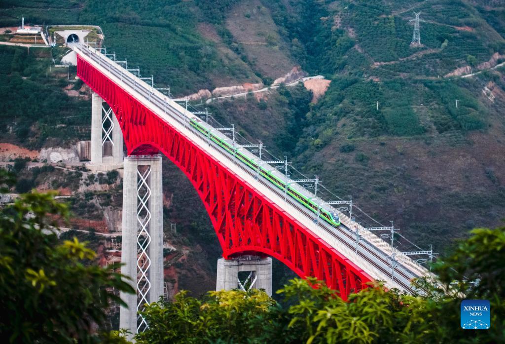 An electric multiple unit (EMU) train of the China-Laos Railway crosses a major bridge over the Yuanjiang River in southwest China's Yunnan Province, Dec. 3, 2021. The China-Laos Railway, a flagship project of the Belt and Road Initiative (BRI), started operation on Friday. (Xinhua/Wang Guansen)