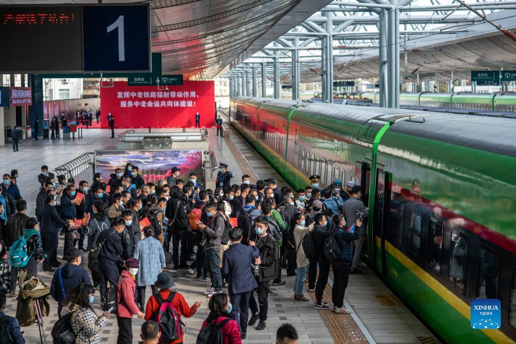 Passengers line up to board an electric multiple unit (EMU) train of the China-Laos Railway at Kunming Railway Station in Kunming, capital of southwest China's Yunnan Province, Dec. 3, 2021. The China-Laos Railway, a flagship project of the Belt and Road Initiative (BRI), started operation on Friday. (Xinhua/Hu Chao)