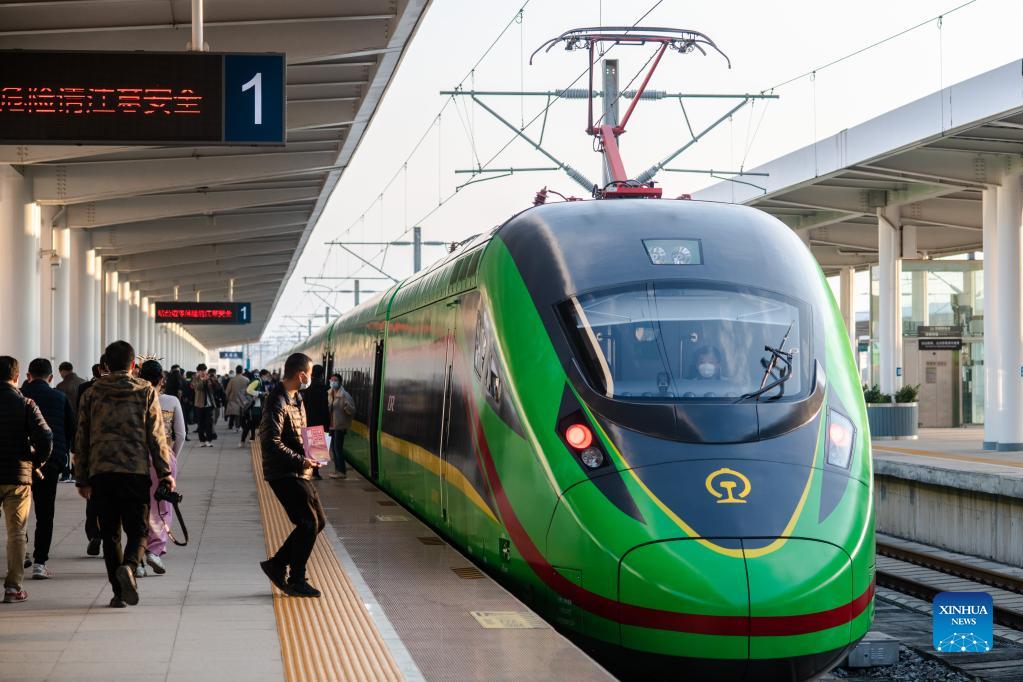 Passengers are about to board an electric multiple unit (EMU) train of the China-Laos Railway at Kunming Railway Station in Kunming, capital of southwest China's Yunnan Province, Dec. 3, 2021. The China-Laos Railway, a flagship project of the Belt and Road Initiative (BRI), started operation on Friday. (Xinhua/Hu Chao)