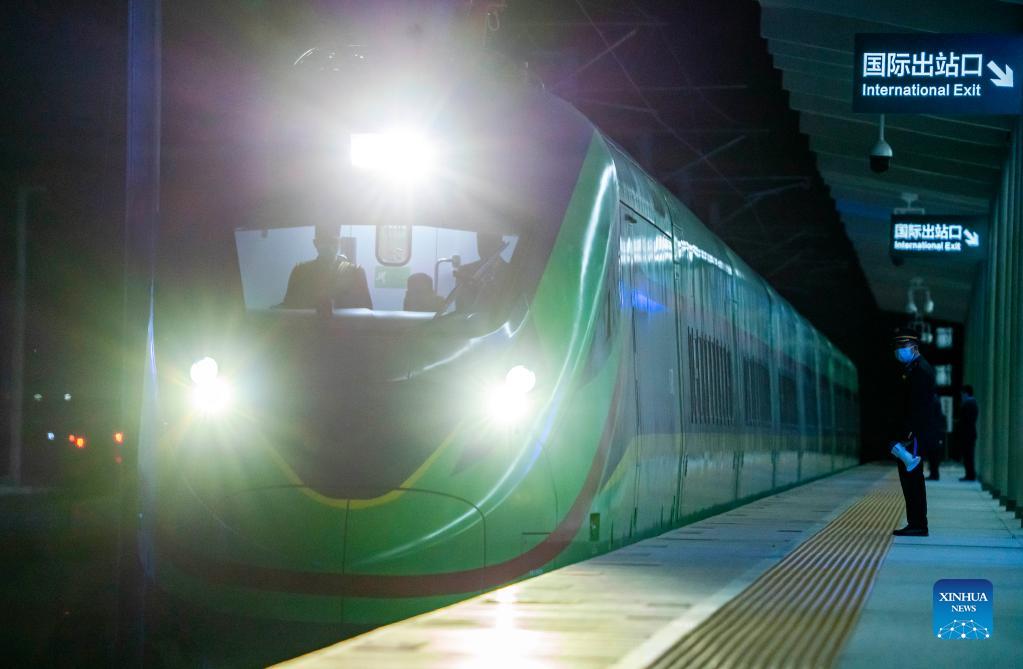 An electric multiple unit (EMU) train of the China-Laos Railway arrives at Yuxi Railway Station in Yuxi, southwest China's Yunnan Province, Dec. 3, 2021. The China-Laos Railway, a flagship project of the Belt and Road Initiative (BRI), started operation on Friday. (Xinhua/Hu Chao)