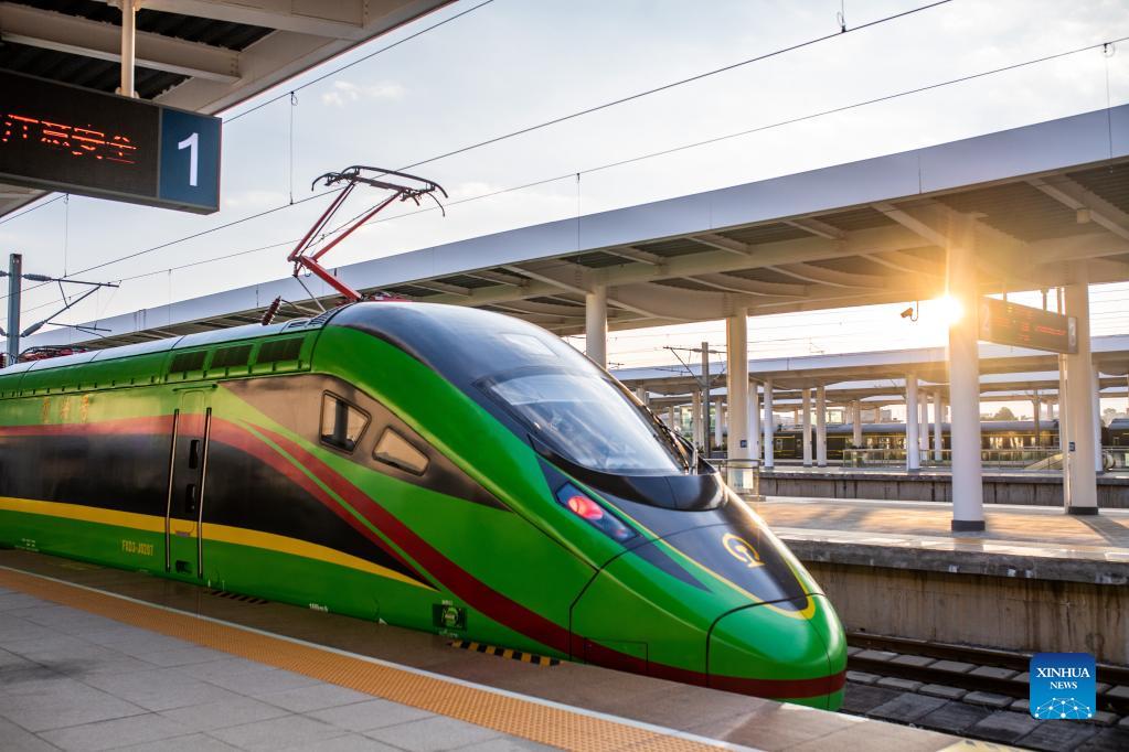 An electric multiple unit (EMU) train of the China-Laos Railway is about to depart from Kunming Railway Station in Kunming, capital of southwest China's Yunnan Province, Dec. 3, 2021. The China-Laos Railway, a flagship project of the Belt and Road Initiative (BRI), started operation on Friday. (Xinhua/Chen Xinbo)