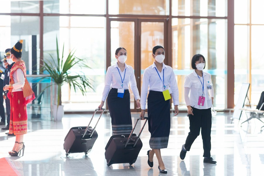 Lao railway staff prepare to welcome passengers of the China-Laos Railway at Vientiane Railway Station in Vientiane, Laos, Dec. 3, 2021. (Photo by Kaikeo Saiyasane/Xinhua)