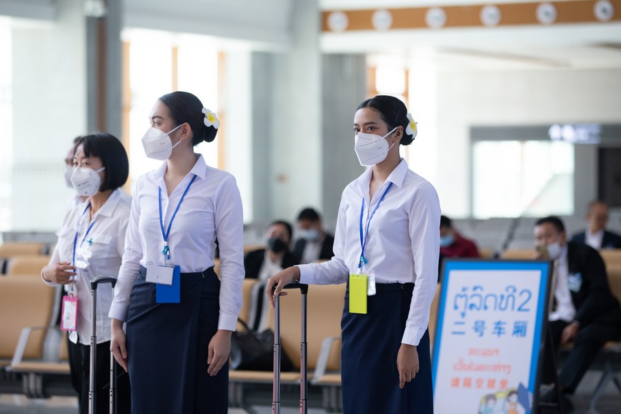 Lao railway staff welcome passengers of the China-Laos Railway at Vientiane Railway Station in Vientiane, Laos, Dec. 3, 2021. (Photo by Kaikeo Saiyasane/Xinhua)