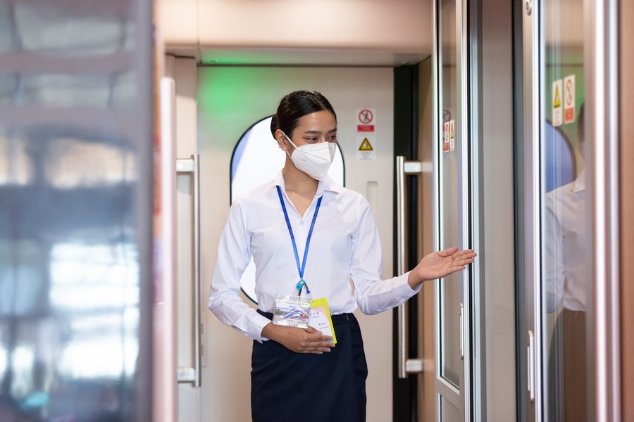 A Lao railway staff member welcomes passengers to board Lane Xang electric multiple unit (EMU) train of the China-Laos Railway at Vientiane Railway Station in Vientiane, Laos, Dec. 3, 2021. (Photo by Kaikeo Saiyasane/Xinhua)