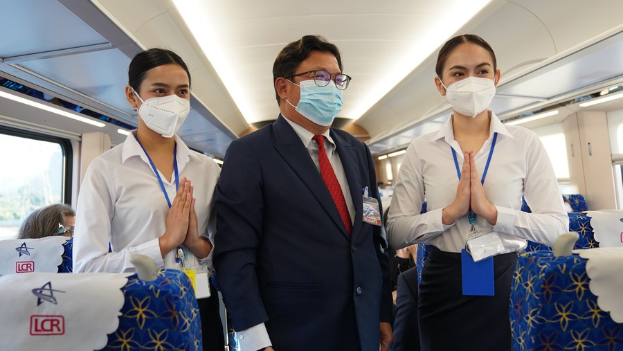 Lao railway staff welcome passengers to board Lane Xang electric multiple unit (EMU) train of the China-Laos Railway at Vientiane Railway Station in Vientiane, Laos, Dec. 3, 2021. (Photo by Li Huan/Xinhua)
