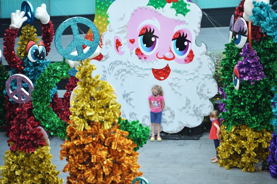 A girl is seen in front of the Christmas decorations at a shopping mall in Bangkok, Thailand, on Dec. 20, 2021. (Xinhua/Rachen Sageamsak)
