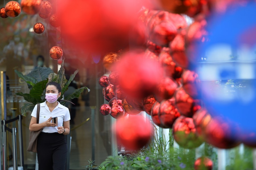 A woman walks through the Christmas decorations at a shopping mall in Bangkok, Thailand, on Dec. 20, 2021. (Xinhua/Rachen Sageamsak)