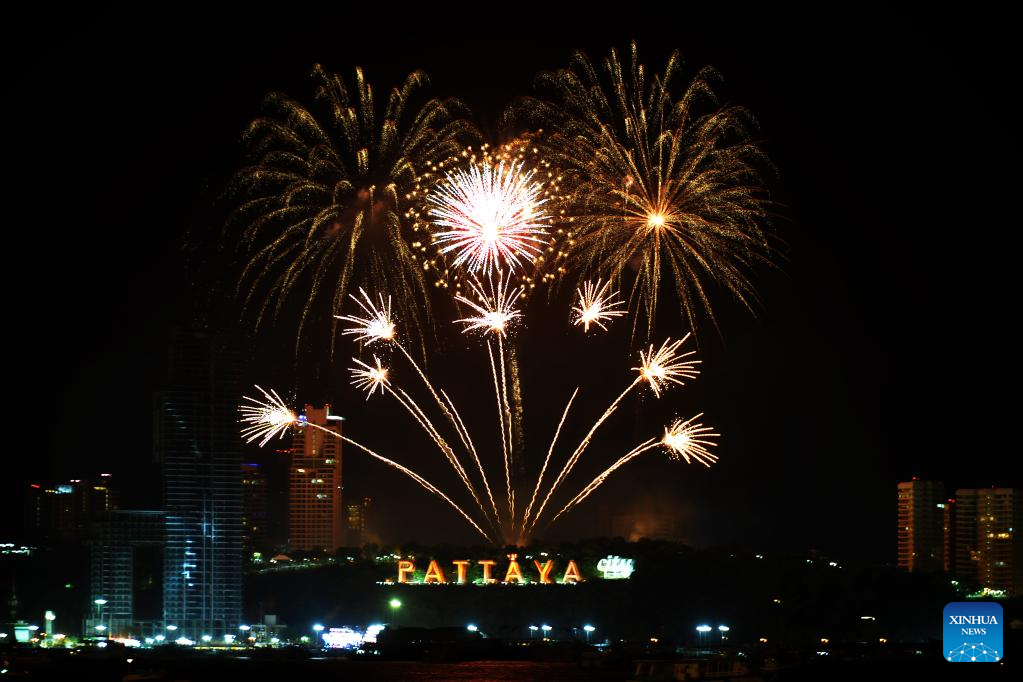 A fireworks display is seen to celebrate the New Year in Pattaya, Thailand, on Jan. 1, 2022. (Xinhua/Rachen Sageamsak)